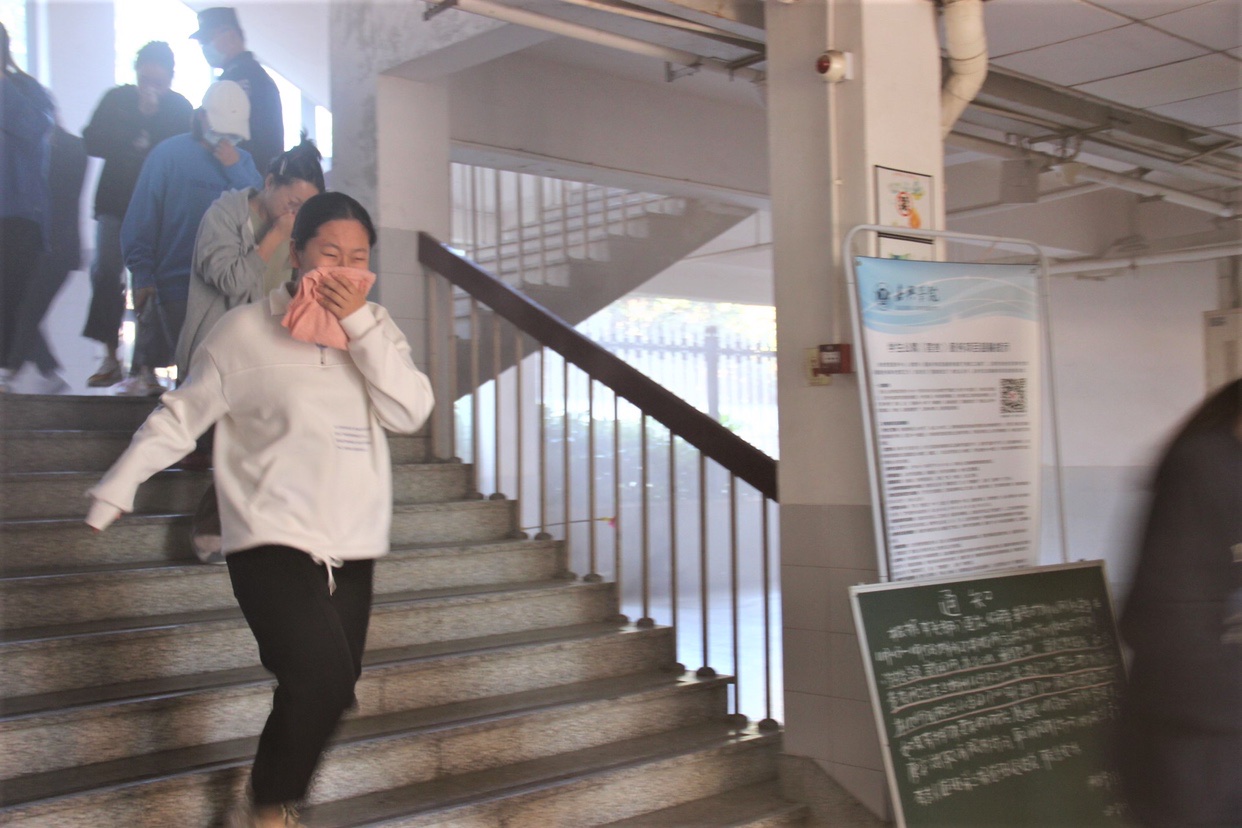 在宿舍消防疏散演习环节,当警报声一拉响,公寓7C座的同学们用湿毛巾捂住口鼻,井然有序快速从宿舍楼逃离到空旷场地。演练通过火灾现场模拟,引导同学们通过亲身体验应急疏散来增强消防安全防范意识,提升消防逃生技能。