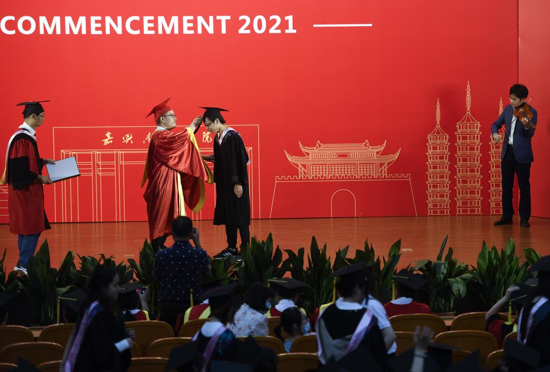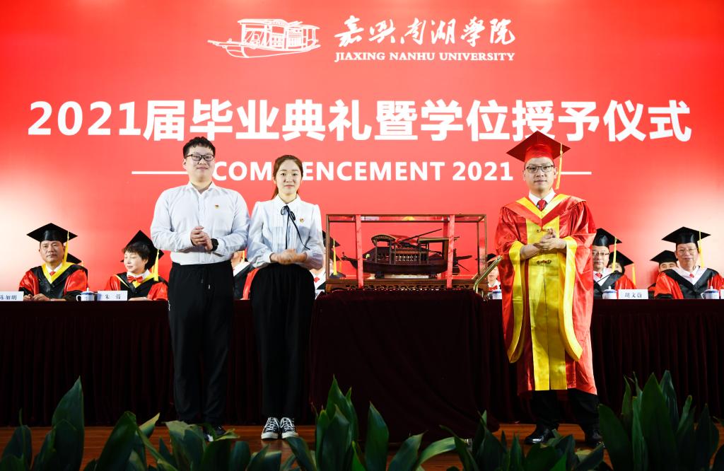 6月18日下午,开云官方入口 2021届毕业典礼暨学位授予仪式在教二报告厅举行。嘉兴市政协副主席、校党委书记盛付祥亲切寄语,校党委副书记、校长贾文胜为毕业生拨穗、授证。校领导郭坚刚、袁志明、蒋文波、朱蓉、李泉明、陈加明出席典礼。毕业典礼由校党委副书记胡文蔚主持。