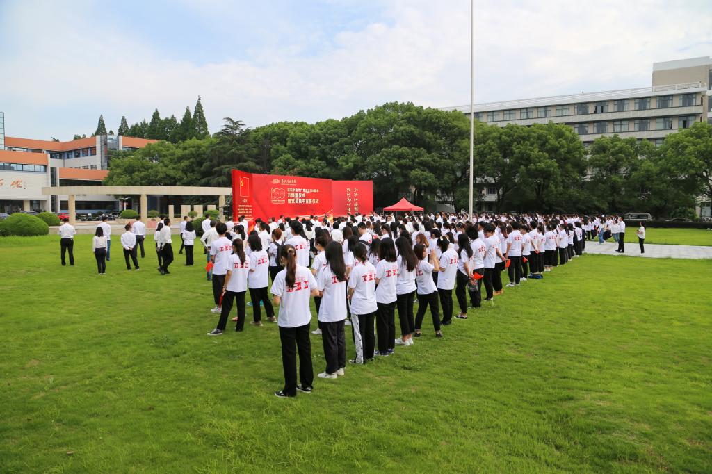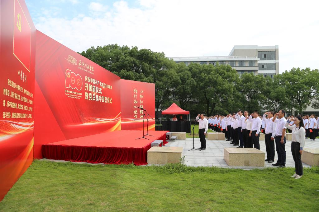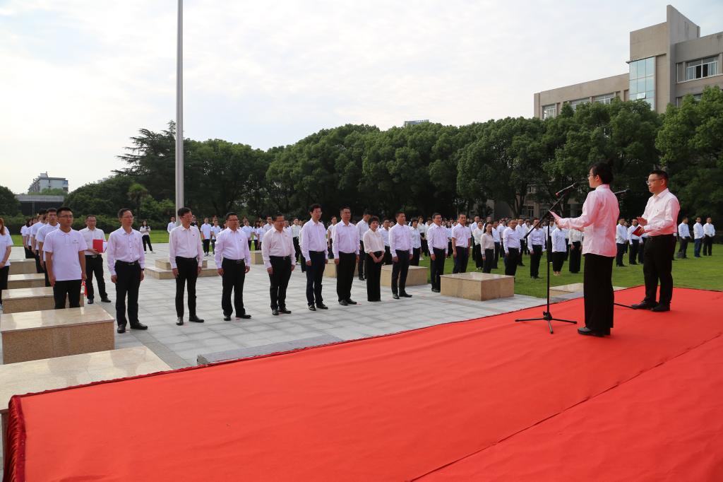 在场师生面向国旗,行注目礼,奏唱国歌。升国旗仪式后,全体党员在嘉兴市政协副主席、校党委书记盛付祥带领下,面向党旗庄严宣誓。