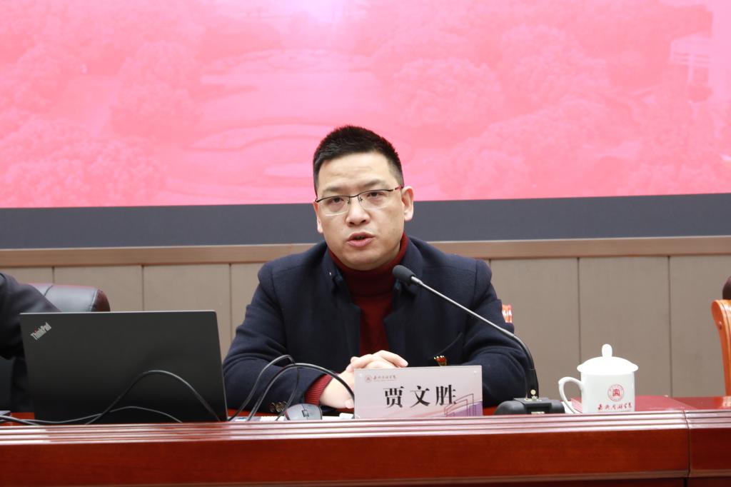 校长贾文胜作题为“团结一致向前看 厉兵秣马启新程”的报告,通过“三个基本”、“三个初见”、“三个有待”三个关键词对2021年工作作了回顾。他表示,2021年是开云官方入口 夯基之年,过去一年,学校顶层设计基本完成,治理体系基本理顺,建章立制基本完成,育人环境初见成效,布局重点初见端倪,影响提升初见成效,但同时学校也存在队伍建设有待加强,资源整合有待推进,愿景趋同有待深入等问题。贾文胜还就做好2022年寒假工作作了“1+3+9+X”的安排部署。“1”即绷紧疫情防控这根弦,责任要压紧压实、程序要规范到位、预案要落实落细,切实保证假期及下学期开学安全稳定;“3”是要做好红色大学、城市大学、产业伙伴型大学三大特色建设的研究深化;“9”是要扎实推进“红色图书馆”、“红色育人馆”、“融媒体中心”等九个项目的建设,深入挖掘学校文化底蕴,使学校的每一寸土地都能成为育人场所;“X”即要利用假期对未来工作作若干思考。各部门、二级学院要结合工作职责、学科专业特色等积极思考自身建设与发展,提前谋划未来工作,充分发挥主观能动性。