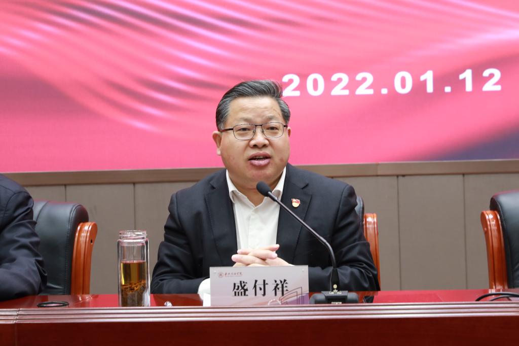 就如何做好2022年工作,实现学校高质量发展,盛付祥提出三点要求:一是要始终把政治建设摆在首位,做“两个确立”忠诚拥护者。要把学习贯彻党的十九届六中全会精神作为当前和今后一个时期的重大政治任务。坚决扛起以中国革命红船起航地命名高校的政治担当,以守好“红色根脉”的政治自觉,深刻领会、准确把握习近平总书记系列重要讲话精神的丰富内涵、核心要义和实践要求。二是要坚决扛起管党治党重大责任,开创基层党建工作新局面。要毫不动摇、毫不放松抓好基层党建工作,驰而不息推动全面从严治党向纵深发展、向基层延伸,不断增强基层党组织的政治领导力、思想引领力、群众组织力、社会号召力。三是要增强本领锚定目标,推动学校高质量发展实现新突破。要察己思齐、加强顶层设计、增强大局观念、加强督办督查。切实提升整体工作质量和水平,推动学校未来高质量发展,以优异成绩迎接党的二十大胜利召开。