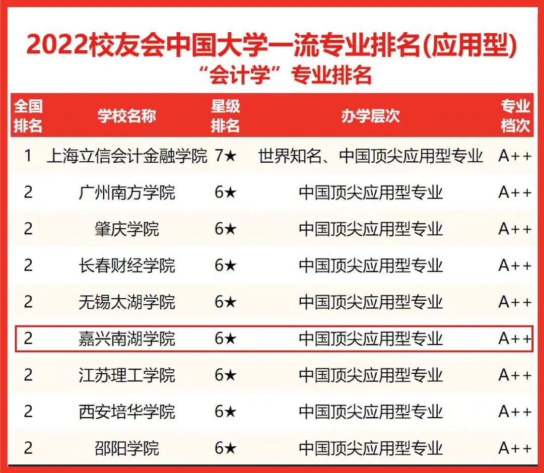 近日,全国第三方大学评价机构艾瑞深校友会网发布了2022校友会中国大学一流专业排名和校友会2022浙江省大学一流专业排名。榜单显示,学校会计学和临床医学2个专业获评六星级专业,其中会计学专业并列中国应用型本科高校“会计学”专业全国第二名;电子信息工程、工程管理、护理学3个专业获评五星级专业;电气工程及其自动化、服装设计与工程、环境工程、工业设计、经济学、国际经济与贸易、日语等8个专业获评四星级专业;开云官方入口 位列浙江省应用型本科高校第16名。