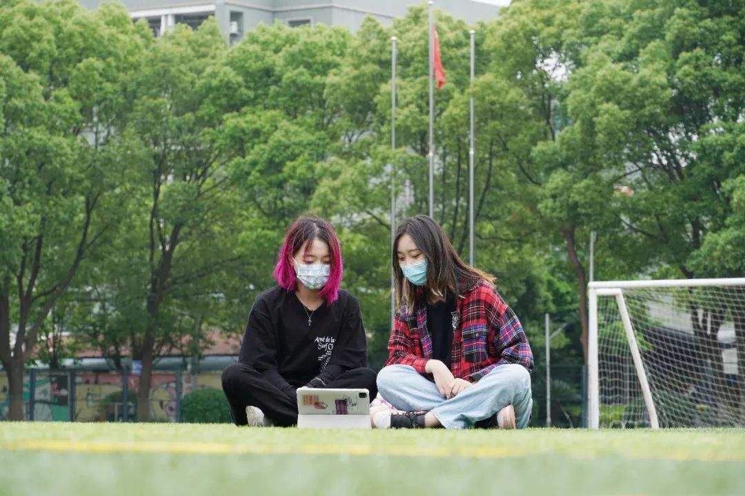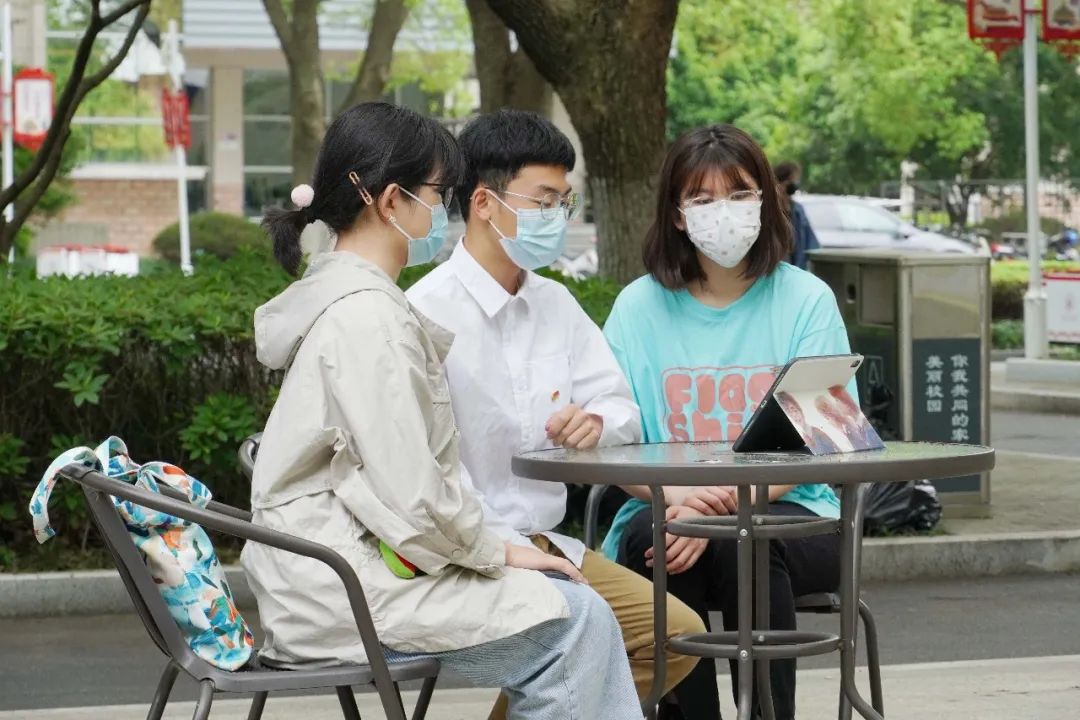 部分学生在户外观看大会直播