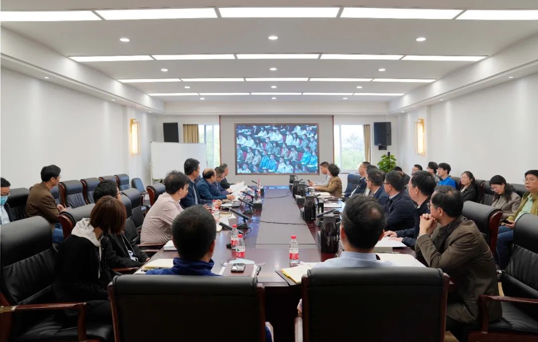 学校领导及中层干部在会议室观看大会直播