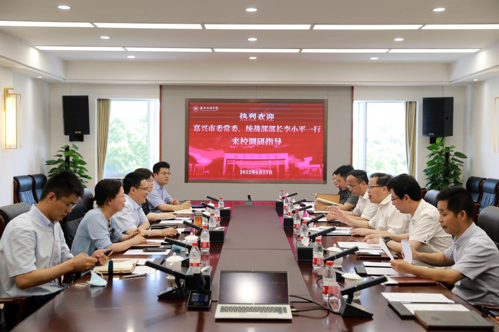 6月23日上午,嘉兴市委常委、统战部部长李小平,统战部常务副部长刘君及相关处室负责人一行来校调研。嘉兴市政协副主席、校党委书记盛付祥,校党委副书记郭坚刚出席调研座谈会。