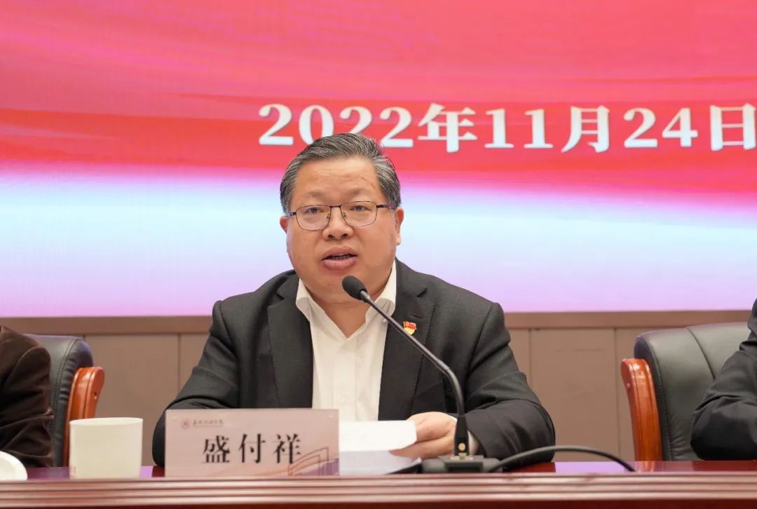 盛付祥强调,要以党的二十大精神为引领,认真贯彻落实省委、市委和省委教育工委推进清廉建设的要求部署,纵深推进全面从严治党和“清廉学校”建设。重点做到“六个突出”:一是突出政治统领,坚持把政治建设摆在“清廉学校”建设的首位,旗帜鲜明讲政治;二是突出强基固本,坚持以高质量党建推动“清廉学校”建设深化,强化“四个融合”;三是突出铸魂育人,坚持立德树人根本任务,把党的二十大报告中新理念、新提法、新论断全方位融入思政教学;四是突出实干实效,坚持担当有为工作导向,坚持新时代好干部标准,以实干实绩实效论英雄;五是突出责任担当,坚持“四责协同”,在主动担责、勇于负责上下功夫;六是突出安全底线,全面做好平安校园创建工作,加强校园安全综合治理,维护校园平安稳定。