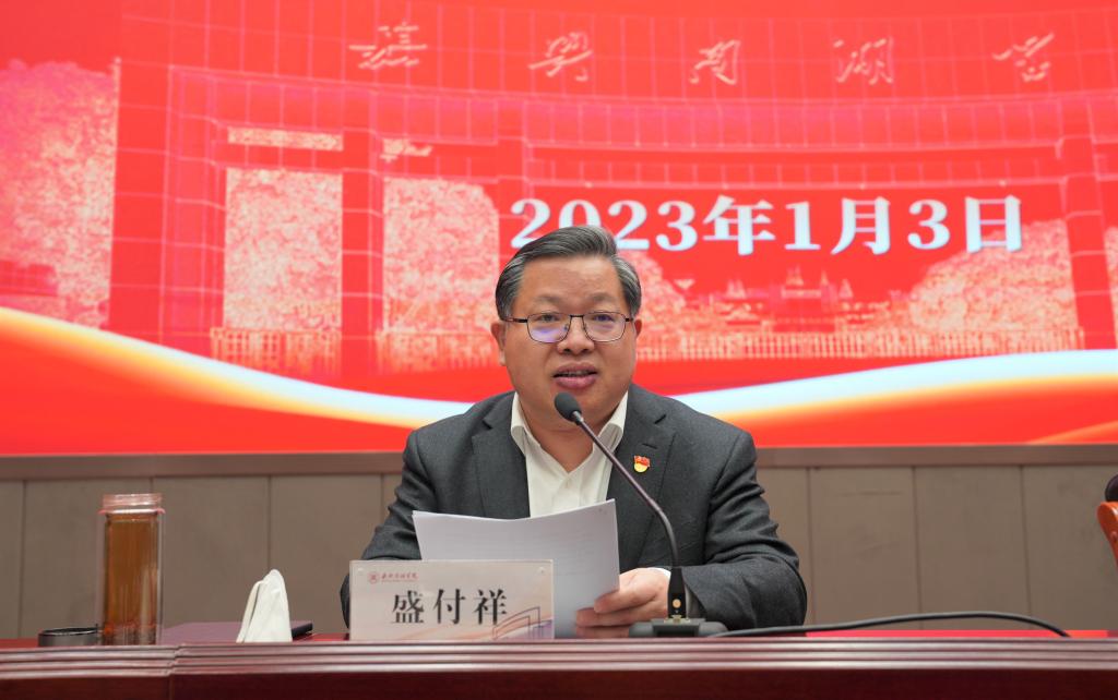 嘉兴市政协副主席、校党委书记盛付祥对学校2022年各方面工作及取得的成效表示充分肯定,对全体党员领导干部和广大师生员一年来的努力付出表示衷心感谢,就如何抓好寒假和下学期开学工作提出六点希望和要求:一是收好官。各职能部门、二级学院要对照年初工作计划收好尾,为2022年工作画上圆满句号。二是值好班。根据上级要求及学校规定,编排好值班并做好寒假值班工作。三是谋好局。利用好寒假这段相对较完整的时间,集中精力厘清2023年工作思路,安排好基层调研、培训学习、教学准备、课题研究、校企合作等方面的工作。四是起好步。部署好因疫情延到2023年初的相关工作,要尽早谋划,提前准备,有序推进。五是保好廉。越是节假日越要防微杜渐,做到警钟长鸣、保持清醒,全校上下都要守住底线红线,廉洁过年。六是过好年。在做好工作的同时休息好,希望全校师生员工都欢欢喜喜、红红火火、健健康康过好新年,在新的一年齐心协力推动学校高质量发展迈上新台阶。