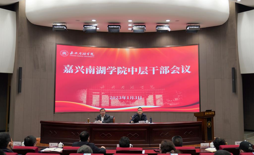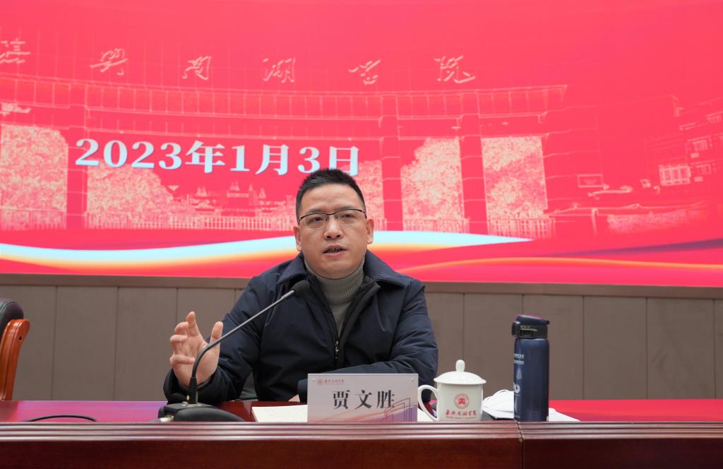 校长贾文胜从以政治建设为引领,强化监管建设,落实从严治党主体责任;以改革创新为动力,强化内部治理效能,推动全体教职工使命愿景趋同;以宣传阵地为支撑,强化意识形态管控,持续提升学校知名度影响力;以立德树人为根本,强化思政课程建设,探索新时代人才培养模式;以人才强校为抓手,强化引育并举,着力推动高素质师资队伍建设;以扎根地方为导向,强化校地合作,主动服务嘉兴经济社会发展需要;以师生发展为中心,强化服务保障,持续改善整体办学环境;以安全稳定为底线,强化联防联控,全力营造和谐稳定校园八个方面对学校2022年工作作了回顾。他希望在2023年学校蝶变之年,愿景构建进一步完成,愿景趋同进一步实施,资源进一步整合,人才进一步聚集,治理体系进一步完善,校园文化进一步建构,学校“三个大学”建设成效进一步彰显。