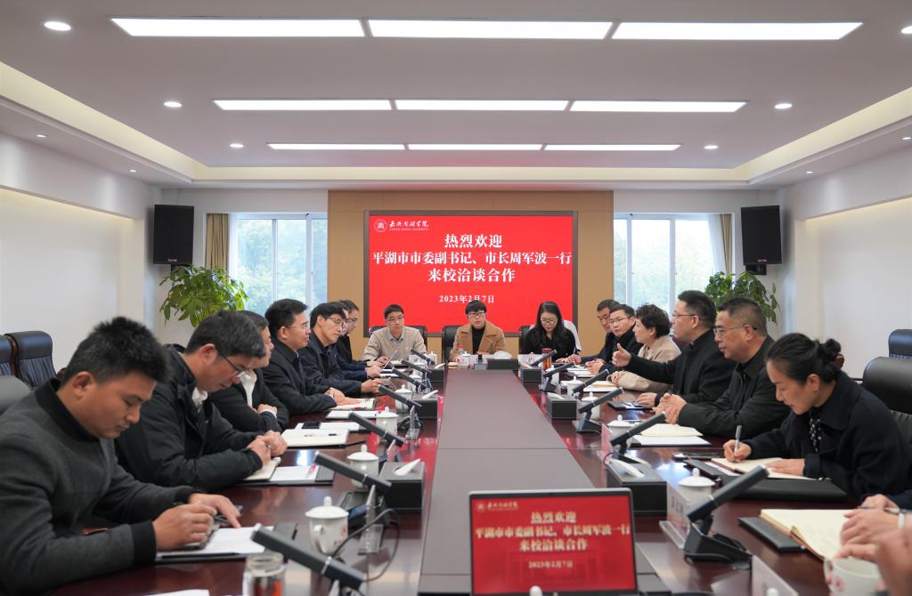 2月7日上午,平湖市委副书记、市长周军波一行来校洽谈合作。校长贾文胜,副校长袁志明、朱蓉出席交流座谈会。