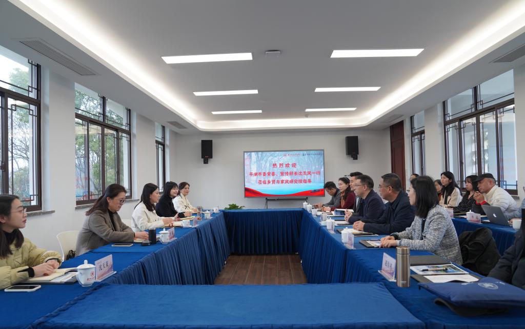 2月22日,平湖市委常委、宣传部长沈志凤一行来校就进一步深入合作进行调研。校党委副书记、校长贾文胜主持召开座谈会,校党委委员、副校长袁志明出席,党(校)办、科研处、社会合作处、乡贤与家风研究院相关负责人参加座谈。