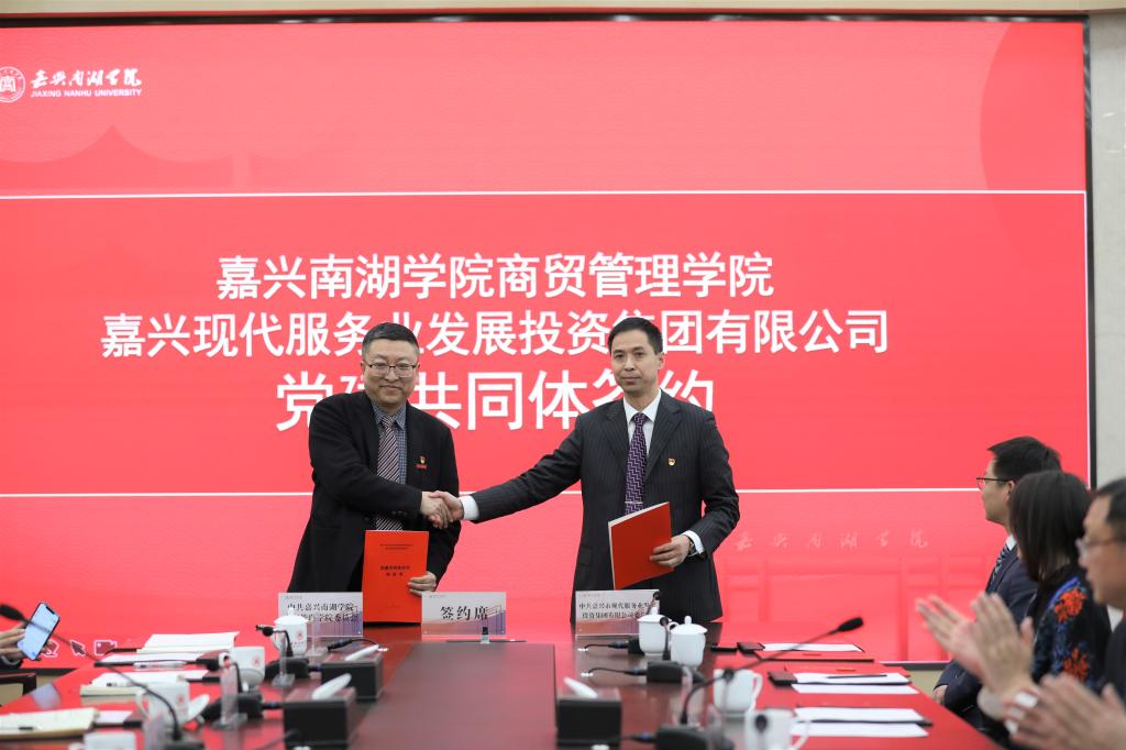 会上还进行了商贸管理学院与嘉兴现代服务业发展投资集团有限公司的党建共同体合作签约。
