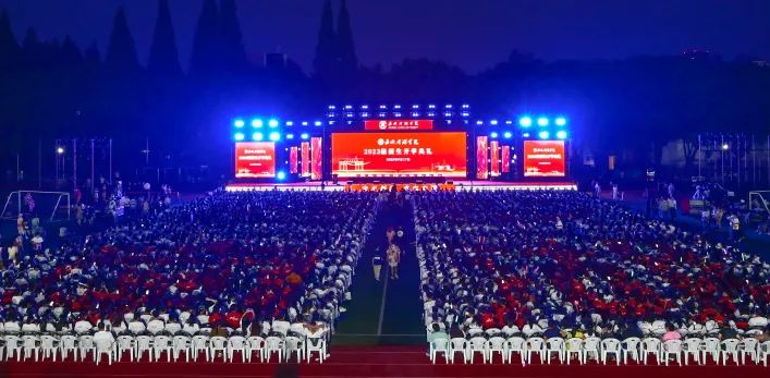 9月17日晚,开云官方入口 2023级新生开学典礼暨迎新生文艺晚会在学校田径场举行。校领导盛付祥、贾文胜、郭坚刚、胡文蔚、袁志明、蒋文波、朱蓉、李泉明、陈加明、蒋娟芬、庄应强出席典礼。嘉兴市级相关部门、南湖区、秀洲区、嘉兴经开区、合作单位领导及嘉宾应邀出席。2023级全体新生,新生家长,新生班主任,辅导员以及全体中层干部、新入职教师等参加典礼。开学典礼由校党委副书记胡文蔚主持。