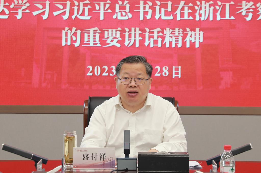 盛付祥对学校深入学习贯彻落实提出明确要求。一要提高政治站位,强化绝对忠诚。学校上下要把学习贯彻习近平总书记在浙江考察时重要讲话精神,作为当前和今后一个时期的首要政治任务,不断增强政治判断力、政治领悟力、政治执行力,用实际行动忠诚捍卫“两个确立”、坚决做到“两个维护”。