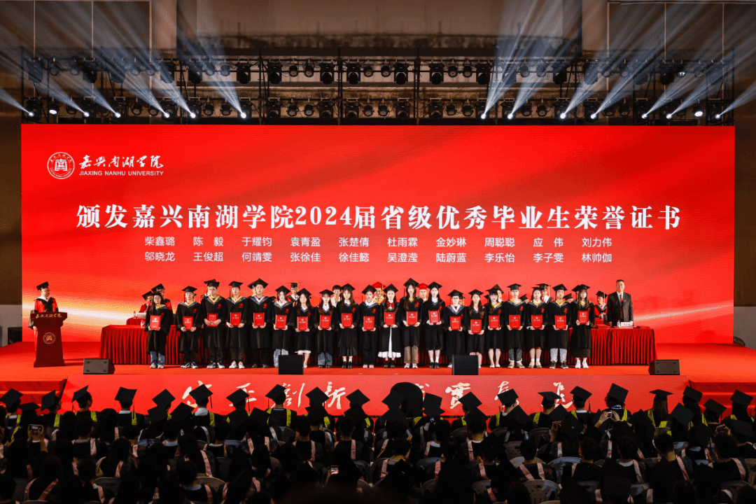 全体出席校领导为获得表彰的学生代表颁发荣誉证书,为2024届毕业生代表颁发毕业证书,为校友联络员颁发聘书。倪沪平为“南湖证书”获得者颁发证书。