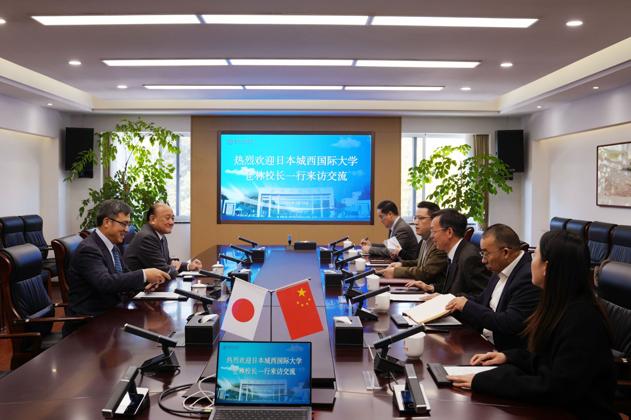 3月18日,日本城西国际大学校长仓林真砂斗一行来访交流。校长贾文胜出席交流座谈。副校长蒋文波,社会合作与国际交流处、人文与艺术学院负责人参加座谈会。