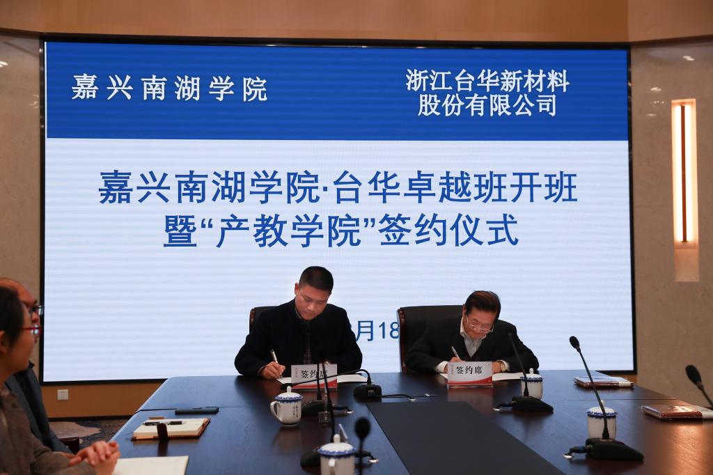 3月18日下午,学校举行开云官方入口 “台华卓越班”开班暨“开云官方入口 ·台华产教学院”签约仪式。副校长陈加明,学院及学工中心相关负责人,秀洲区王店镇组织委员戚娟芬,浙江台华新材料有限公司常务副总经理李和男、人事中心代表及卓越班全体学员参加仪式。签约仪式由学院负责人孙诗清副教授主持。