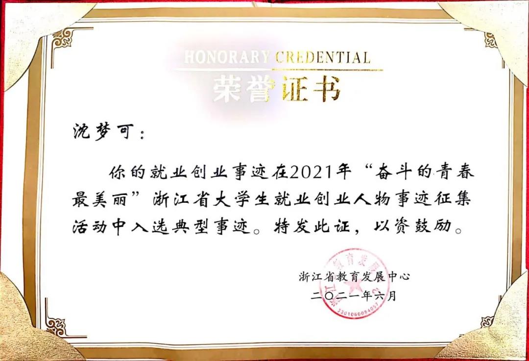 近日,浙江省教育发展中心组织开展了2021年“奋斗的青春最美丽”浙江省大学生就业创业人物事迹征集评选活动。我校00后“女枪王”沈梦可被评为“浙江省大学生就业创业典型人物”,荣获“军营大学生战士典型人物”称号。