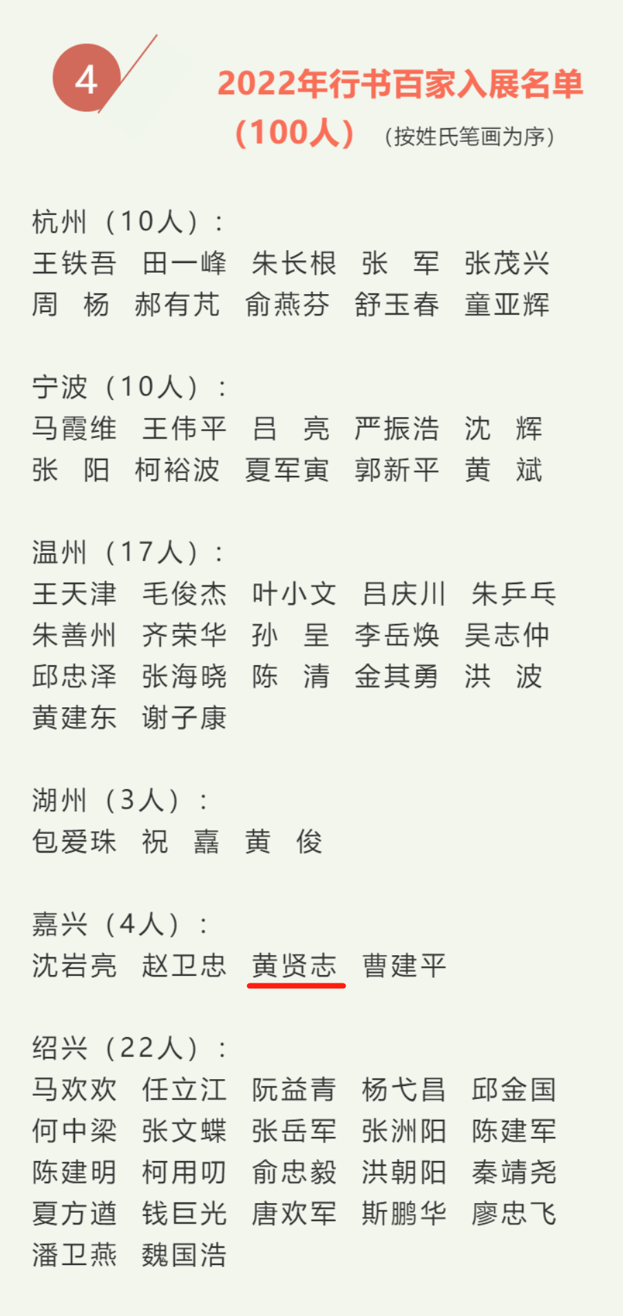 此前,2022年浙江省书法家协会“年度百家”作品遴选评审工作在杭州举行。通过初评、交叉复评、复议等程序,最终评出篆书、隶书、楷书、行书、草书及篆刻六百家。黄贤志老师也入选了2022年行书百家入展名单。