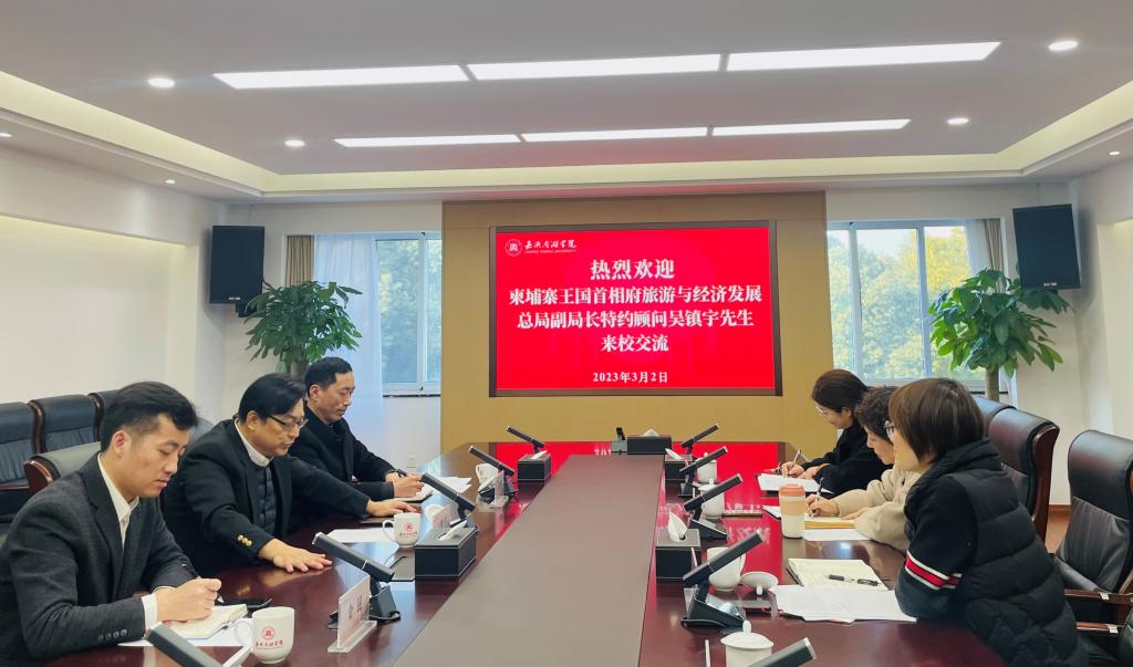 3月2日下午,柬埔寨王国首相府旅游与经济发展总局副局长Svay Nakry(娜丽)特约顾问吴镇宇先生前来我校访问,就双边推动国际产教融合展开洽谈和交流。嘉兴市外办党组成员、市友协专职副会长王建军,副校长朱蓉出席交流座谈会。